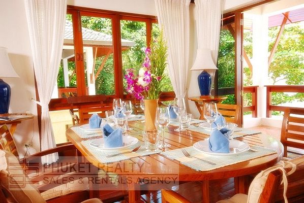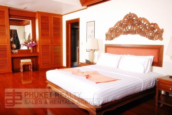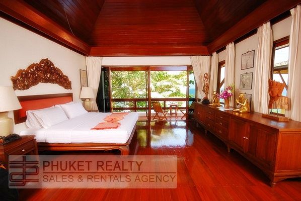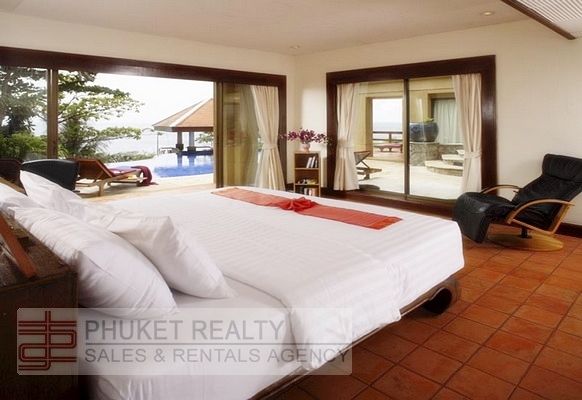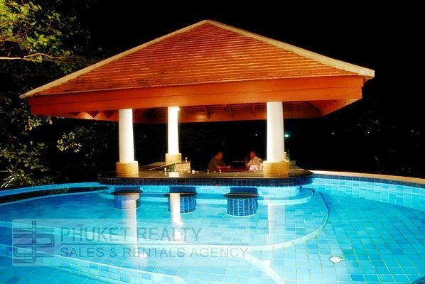 This delightful villa is ideal for either a relaxing getaway or great parties. The pool has a swim up bar which allows you to sit in the pool with a cocktail in hand and watch the sunset across the Andaman Sea in front of you. The villa has been built on three levels sloping down to the sea. Each level has excellent views out to sea. There are bedrooms on each level with the swimming pool located on the lower level along with the bar, one bedroom and the entertainment room. The villa consists of three buildings, one with three bedrooms on two levels, one with the entertainment room, dining/sitting room and pantry also on two levels and the third building has the servants quarters and main kitchen hidden on the lower floor behind raised flower beds with the upper level given to one bedroom and a large covered veranda.