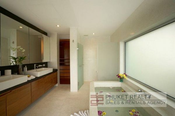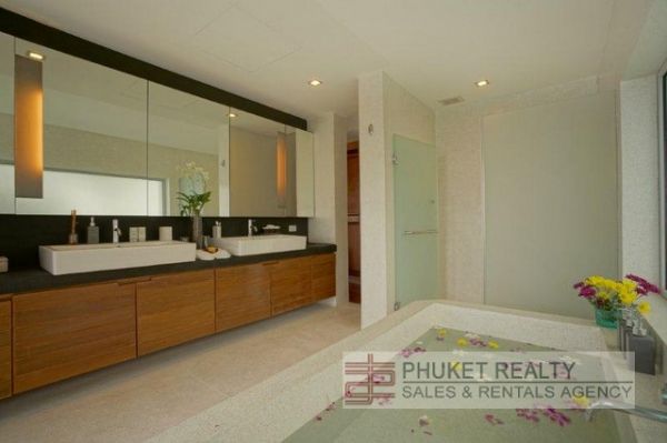 A fully equipped Western kitchen and an outdoor, undercover Thai kitchen are simply aching for someone to cook up a royal feast. The 20-metre infinity lap pool allows you to swim in the sunshine and still enjoy the magnificent view over Surin Bay. A flight of polished timber stairs leads up to the spacious master bedroom which boasts a double walk-in wardrobe with enough shelves and hanging space to house even the largest clothes collection. And for those who like to watch a bit of TV before nodding off at night, a giant screen rises almost magically from a console at the foot of the king-sized bed a the touch of a button. There is a magnificent viewing deck outside the bedroom, complete with two double daybeds. A study area off to one side also looks out over Surin Bay. The main guest room is almost as luxurious as the master suite. Both have luxury ensuite bathrooms with rain showers, twin basins, and translucent walls and doors.