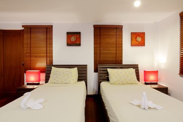 The 6th bedroom is located below the pool level in its private nook, this room has twin beds and a shower.