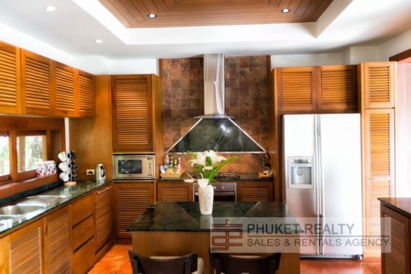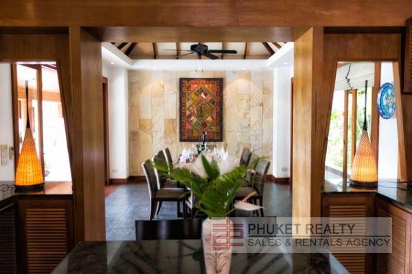The villa’s stylish living room brims with vibrant silks, statues and works of art, and is furnished with an earth-toned water hyacinth sofa set under a peaked, wood-beam ceiling. Opening fully out to the pool terrace, this is an inviting place to escape the afternoon heat, relax and enjoy the state-of-the-art surround-sound entertainment system, which is also connected to outdoor speakers along the eaves. Next to the living area, and also open to the pool terrace, the dining room is furnished with an elegant wood and rattan table for 10 guests. Its vaulted ceiling, textured sandstone wall and beautiful teakwood and slate floor lend an added sense of grandeur. Sharing this open-plan room is the warm and welcoming kitchen, designed with forest-green granite worktops, wooden cabinetry and smart stainless steel appliances.