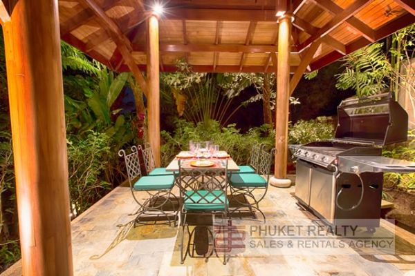 A stone path leads from the pool terrace to a shady garden area and another fan-cooled sala with a dining table for six and barbecue.