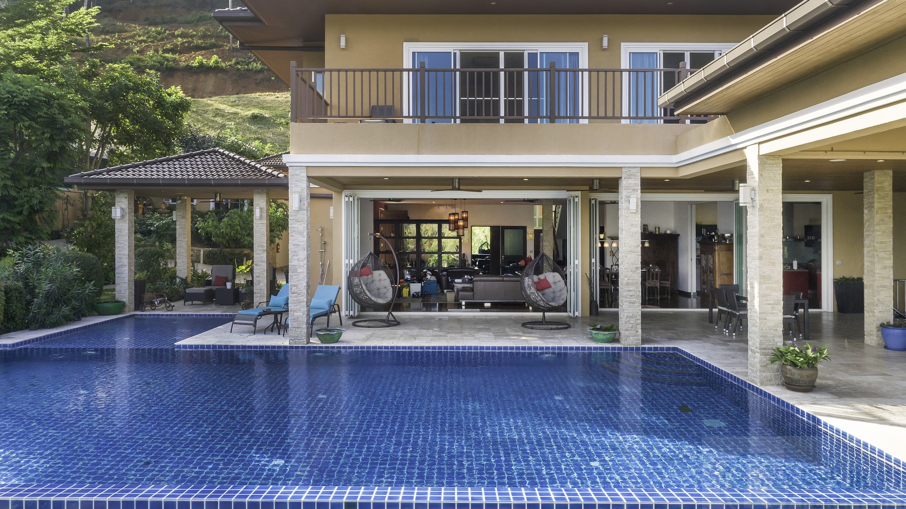 Also on the ground floor is one bedroom with ensuite bath and a separate office area. Upstairs are five additional ensuite bedrooms and a large balcony with unbelievable scenic views. In addition there is an annex / guest house and two maids rooms.