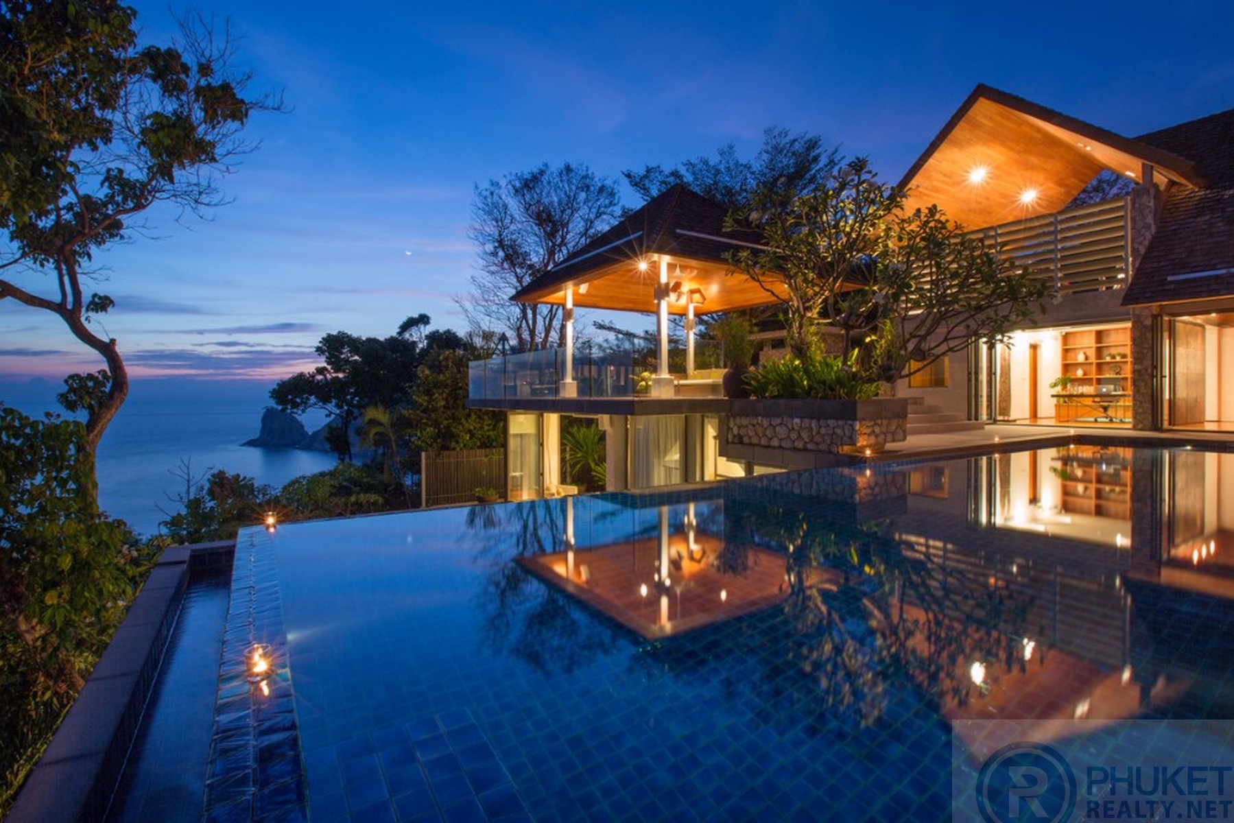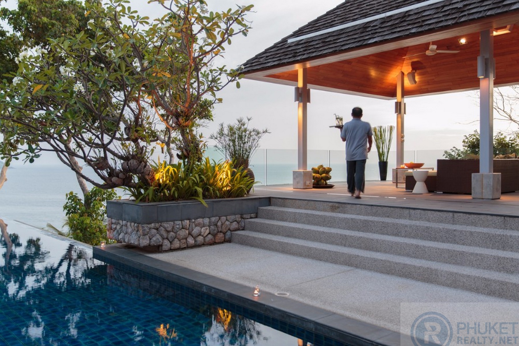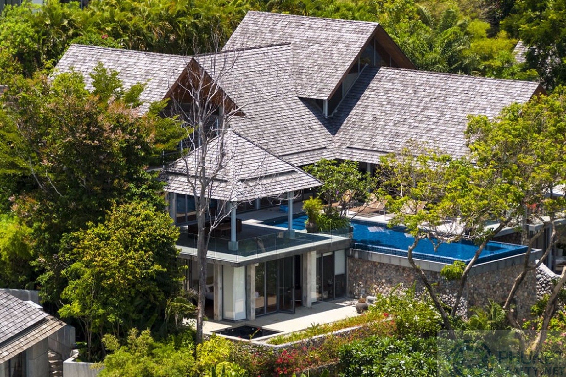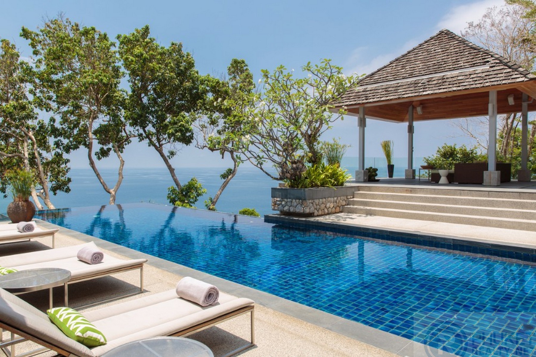 It is direct Oceanfront, has a 4,000 Sq.m garden with lawns and access to the ocean in addition to the 1,000+ Sq.m villa plot. From the villa, you will see sunrise and sunset as well as open ocean, Patong bay and Patong Beach viewsThe villa style is contemporary Asian by architects, Original Vision. With two main levels, integrated design for family livingwith a light and modern feeling inside.It has 6 ocean view bedrooms but can be expanded to 7 or even 8.Currently configured as 4 bedrooms and an ocean view office and large media room and yoga studioThe master bedroom suite has its own outdoor sea view jacuzzi and a second outdoor bathEach bedroom has its own terrace spaceThere are three ensuites, two bedrooms share a bathroom and the 6th bedroom ( now used as the media room, has a bathroom design which will be fitted to a buyers taste on transfer if required ) The living room has 6 m high vaulted golden teak line ceilings and all around floor to ceiling high quality bi fold anodised aluminium doors. Thus the whole area and front of the villa also can be opened up to the fresh air and allow direct terrace access.2nd, lower living area great for TV, Games, children etc.Large open plan ocean view, kitchen and dining roomWet and dry saunasPlenty of sun bed area around the 15m infinity edge swimming poolOutdoor barbecue and dining area large enough for 20 person seatingOutdoor dining / relaxing sala with 270 degree ocean and bay view’sThere are extensive staff quarters at the rear of the villa of over 100 Sq,m . These include a 2nd full western kitchen, staff bedrooms and common area, large laundry. The entire staff quarters access the main villa levels through their own private doorways so keeping guest privacy to a maximum.While there are many wonderful oceanfront villas on the market at any one time in Phuket, this is the only West coast oceanfront villa with a such a large usable garden in front of it, between the ocean and the villa. Over 4,000 Sq.m of combined lawns, trees and oceanfront. Perfect for events, relaxing and children to play.The Samsara estate is wonderfully positioned on its own headland overlooking the open ocean, Patong Bay and Patong Beach. It is private and secure and yet only 7 minutes’ drive to down town Patong and 12 minutes’ drive to Surin Beach.There is direct walking access to Nakalay and Blue Coral Beaches from internal estate pathways. Samsara owners enjoy preferential access and rates at the new 5 Star Naka resort on Blue Coral Beach.The estate has the most complete infrastructure of any Residential only estate in Phuket. It has its own one million litre water storage facility, two generators and fire hydrant system. There is a dedicated management office from which villas and the estate are maintained and rentals can be arranged. This villa has the best location in the estate, the largest and most usable oceanfront garden not only in Samsara but anywhere along the entire west coast. It is a modern, functional and well-maintained villa which is ready to move in immediately but also has the potential to enlarge with an additional two bedrooms if required.Offered at 4.8m USD with Thai Bath price adjusting to match the USD price