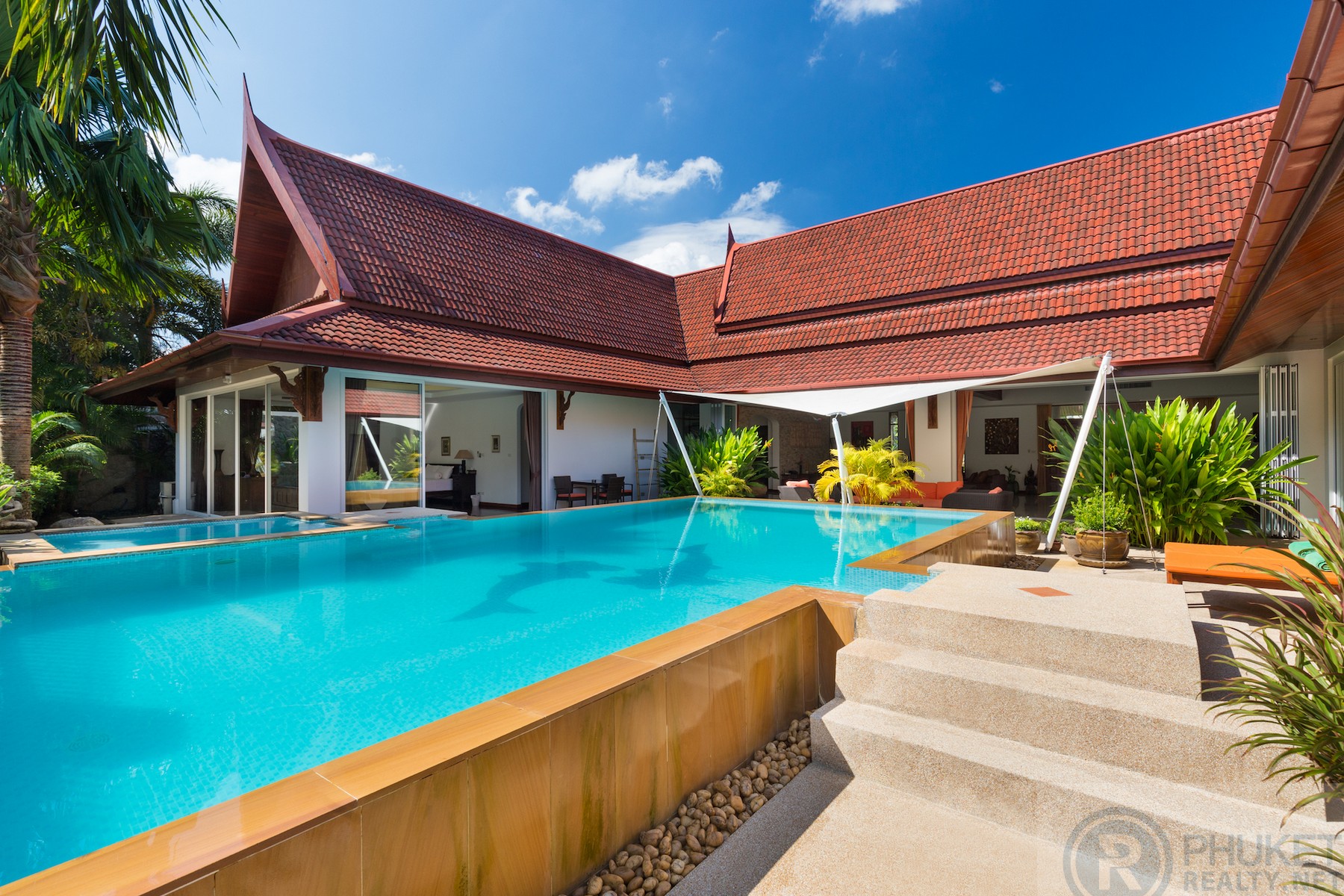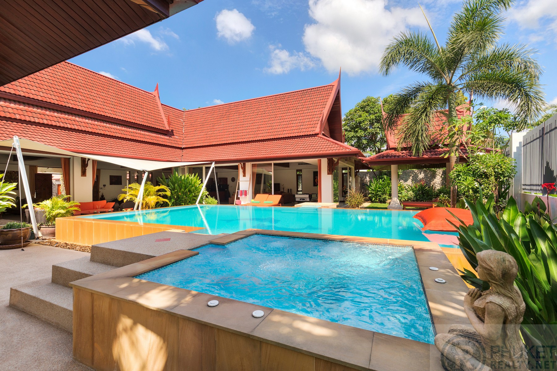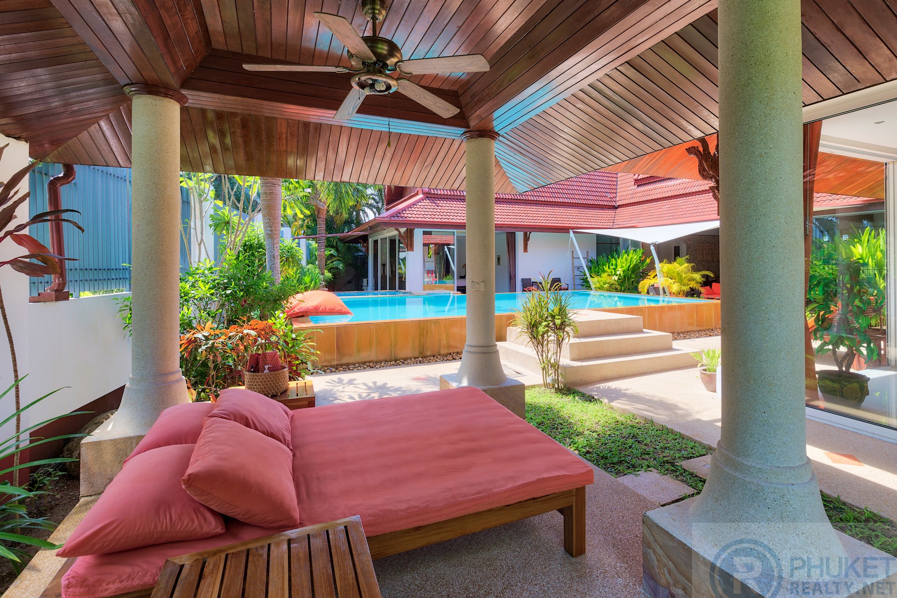 Beautifully maintained and presented U-shaped pool villa fronting onto Kathu Golf Course in the heart of the island. Easily accessible to all parts of the island.The villa is very accessible for International schools, Phuket’s main shopping centres and only 15 minutes to Marinas and Patong.The villa is in a bungalow style with distinctive vaulted Thai style roofing.The spaces in the villa are enormous with large open dining and twin living areas which open directly to the gardens and pool.Currently the villa is configured with 3 large bedrooms with private ensuite bathrooms. However, the design is such that the villa can easily be configured with 5 bedrooms all on the one level.The property is walled by a granite stone high wall which gives privacy and serenity to the villa itself.There is a twin car garage and space for two more cars in the parking area.Materials are all to a high standard, incising teak wood, easy to maintain ceramic tiling in the living areas and top-quality Sun Paradise window systems.The pool is the focus of much of the villa and has a built in jacuzzi at one end with separate massage and dining sala at the font of the villa on the other side of the pool.Currently owned by Thai Freehold of the 1,200 Sq.m land plot and foreign freehold of the villa structure.