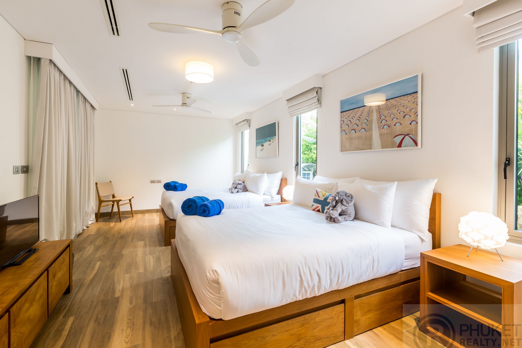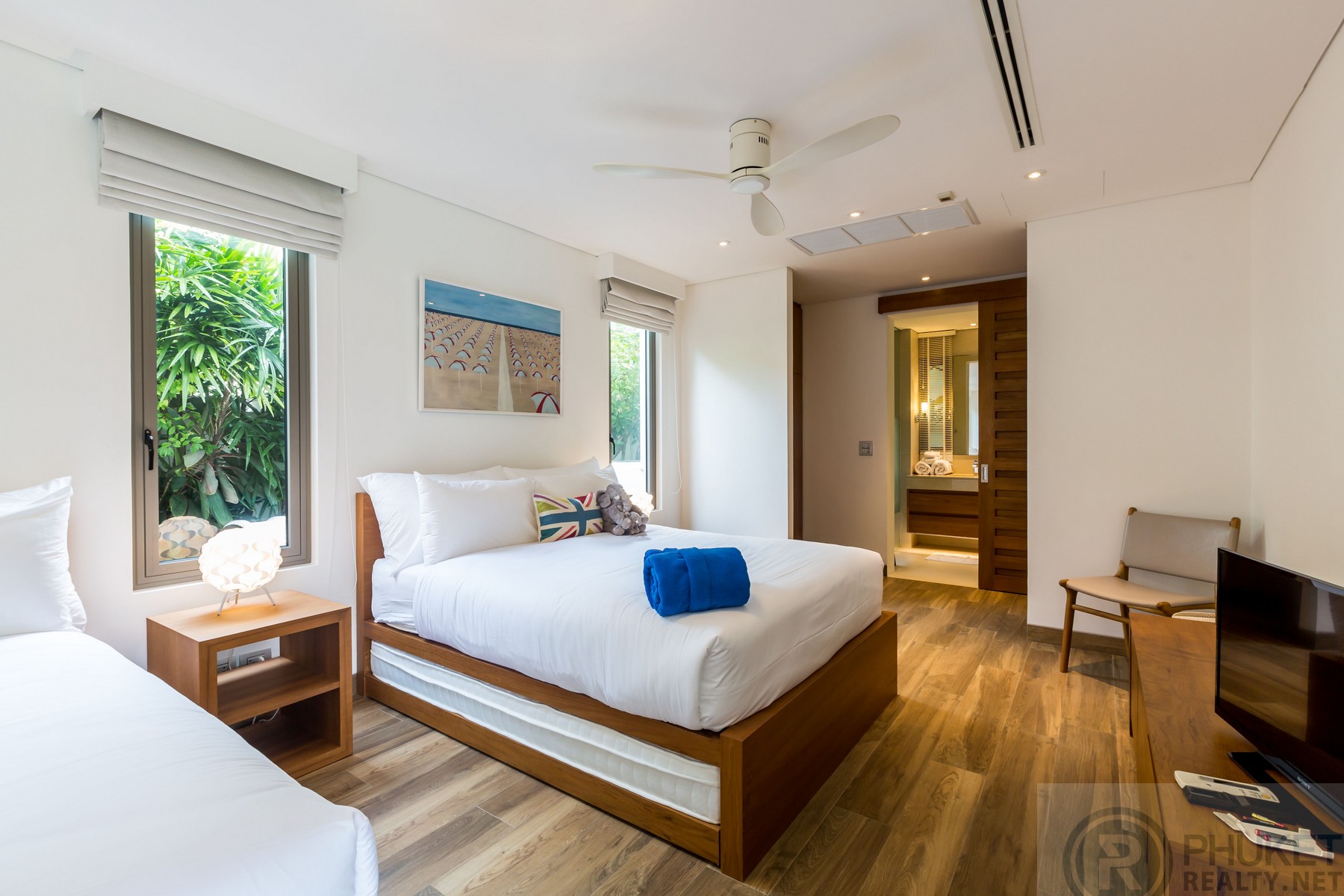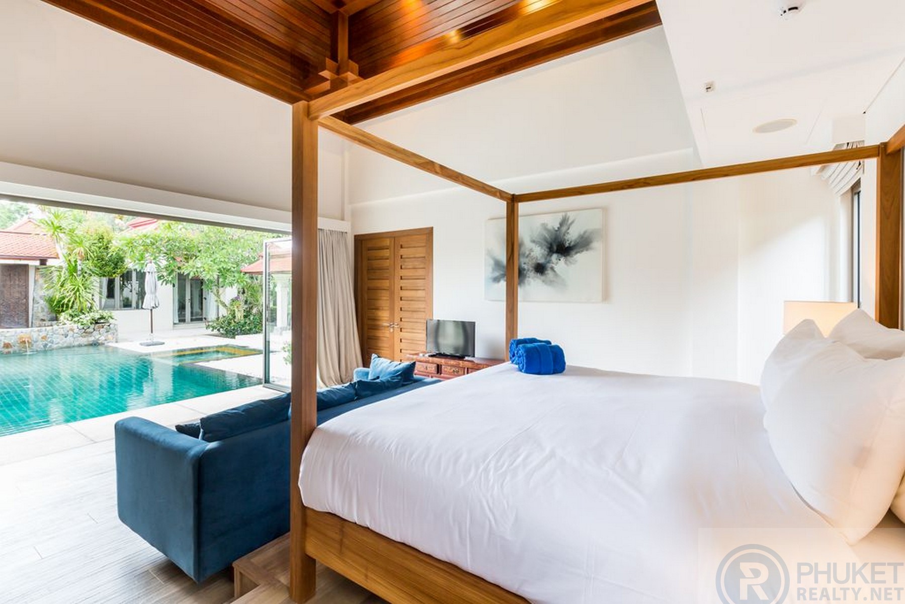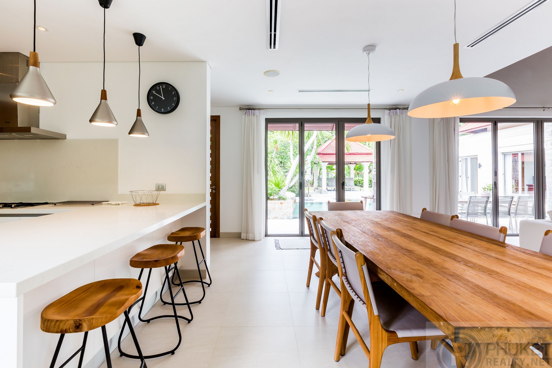 The beautiful four-bedroom pool villa completely renovated is an oasis of calm that exudes tranquility. It is in the exclusive Sai Taan estate which is nestled alongside the five stars Laguna Phuket Resort Complex on Phuket's glamorous West coast. The Villa effortlessly blends comfort and elegance. The minimalist contemporary design with vaulted ceilings creates an atmosphere that is relaxing and serene, creating an instant feeling of Zen-like calm. The Villa can comfortably accommodate up to twelve people, making it the perfect vacation home for couples, families or groups of friends. The Villa is ideally located within a few minute drive of several stunning beaches, including Surin, Bang Tao and Layan. Laguna also boasts several excellent restaurants and amenities. The Villa is also only several minutes’ drive from some of Thailand's (and indeed Asia's) most famous Beach clubs. As you enter The Villa through carved teak doors, you enter an oasis of calm. The calming sound of a fountain splashing into the shimmering pool is the only sound that breaks the calmness. The expansive outdoor area includes a lush garden with a gorgeous sala, perfect for relaxing in the shade. The pool loungers and the outdoor dining furniture are contemporary and stylish, in keeping with the minimalist contemporary feel of the villa. There is also a stainless-steel BBQ for poolside BBQs, and a stylish covered bar by the pool, perfect for cocktails. The kitchen is fully equipped. The dining table is the epitome of contemporary sophistication with pendant lamp lighting hanging above the 8-person table for an optimal dining experience. The living room has sumptuous seating for up to 8, great for lounging and watching a film on screen TV or browsing through the extensive music library, which is connected to indoor and outdoor speakers. As a privately-owned villa in a 24-hour gated community, this Villa allows you unlimited relaxation and safety, while still being within reach of the attractions of one of Asia most sought after holiday destinations.