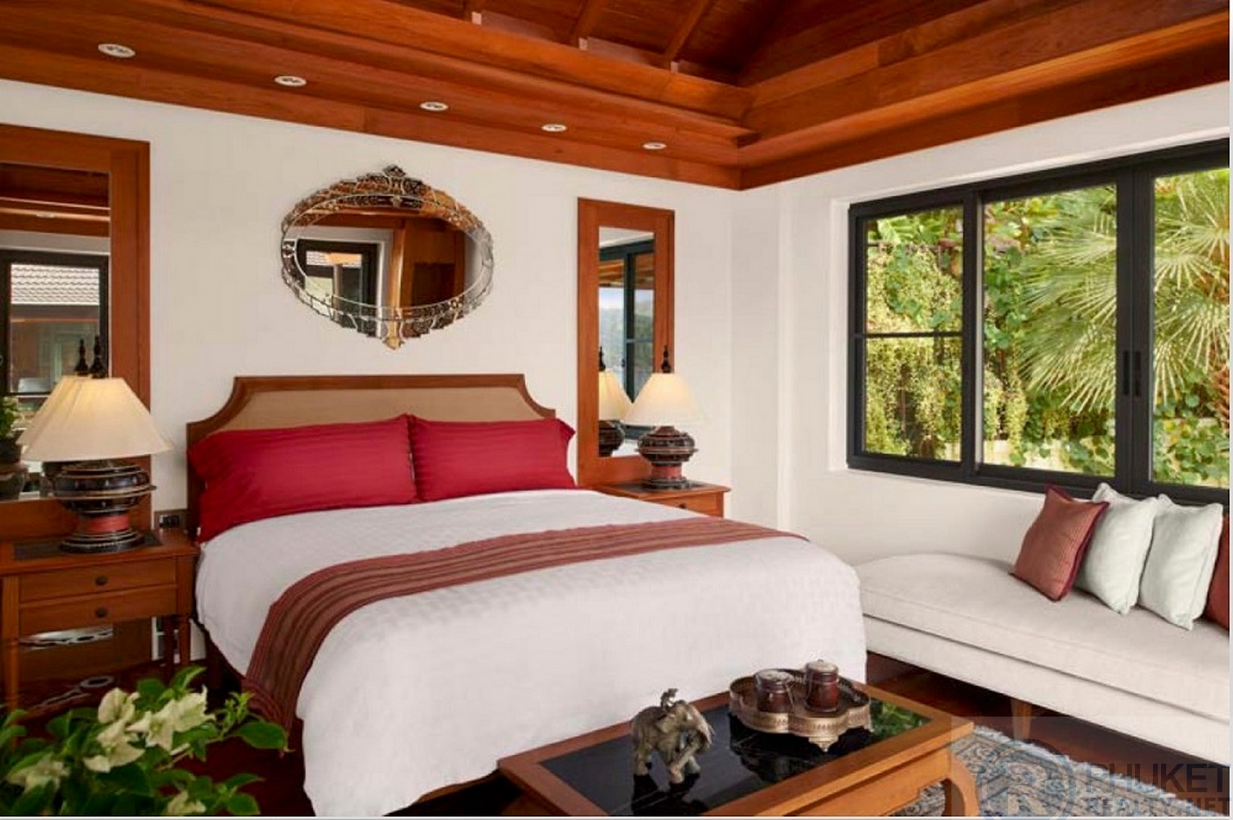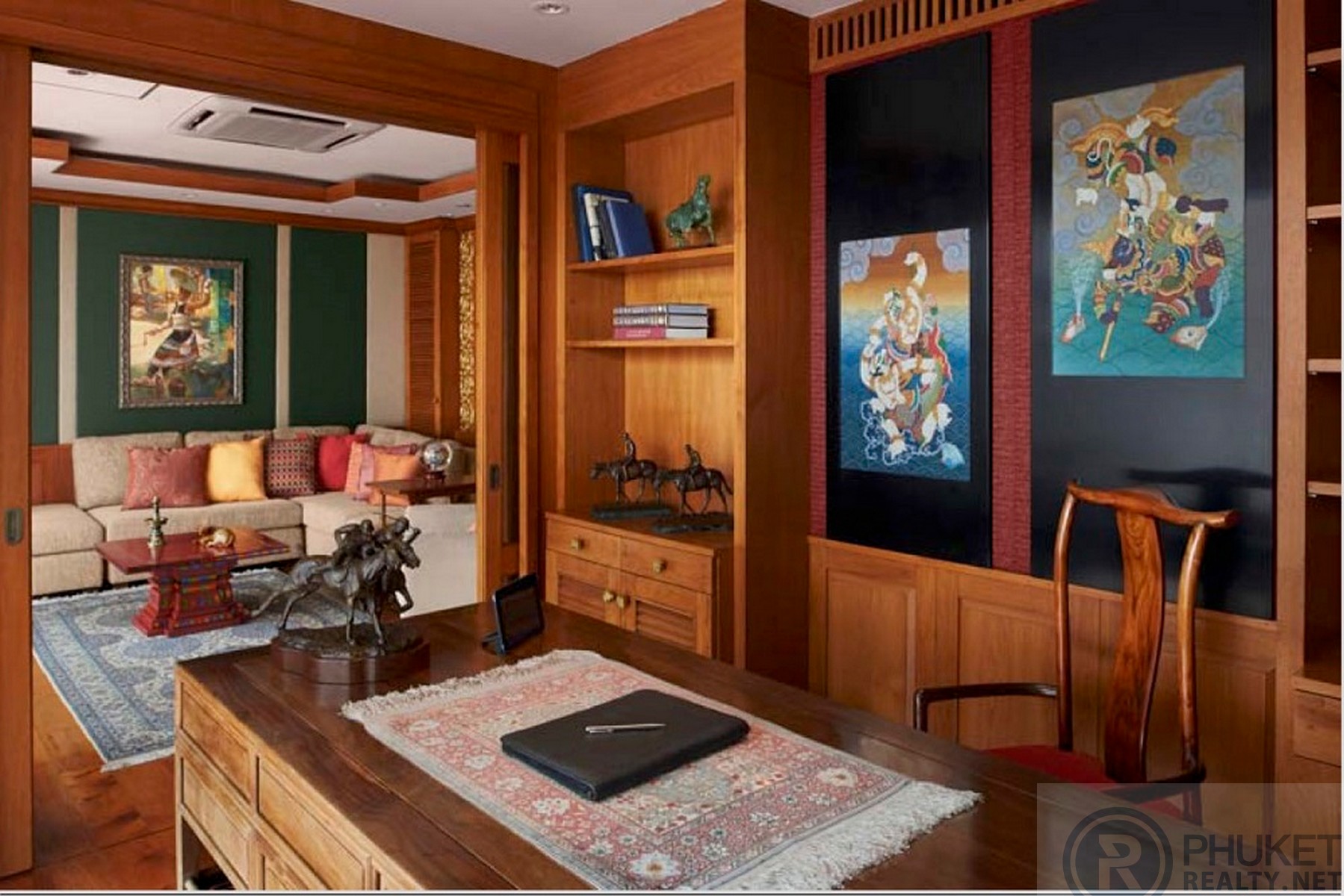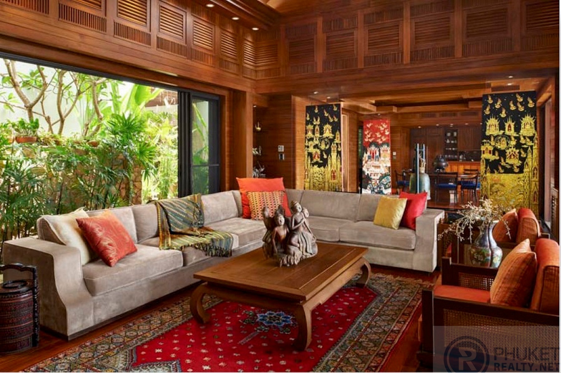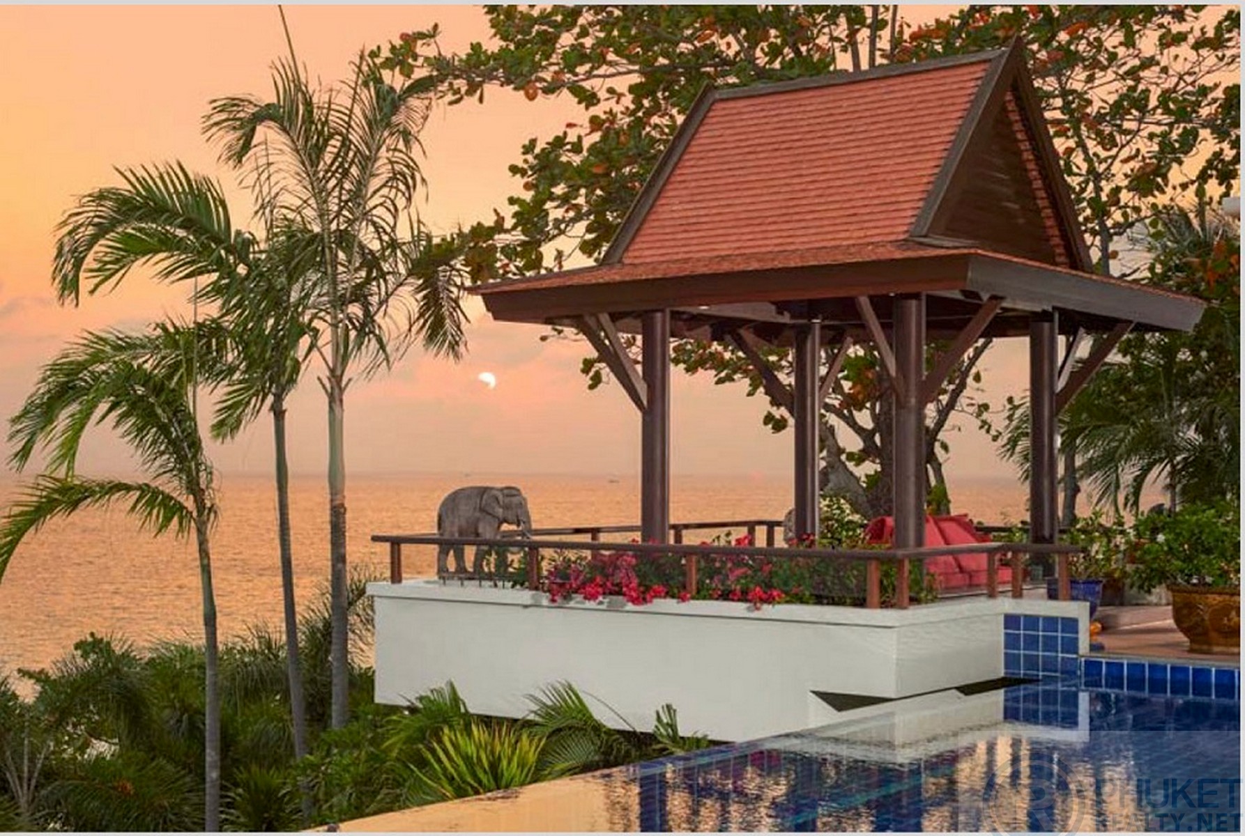 https://my.matterport.com/show/?m=MgjVBVgXfXVThis beautiful luxury ocean front villa is ideally located within an upscale private development only a few minutes’ walk from two of Phuket’s premier white sand beaches, Kata and Kata Noi.The villa enjoys uninterrupted 180-degree panoramic ocean views. Spacious airy living space of this 4 bedrooms villa blends seamlessly with outdoor area, complete with private infinite-edge swimming pool plus sizable decking, a living sala and large manicured tropical garden with direct ocean access.Slender teak wooden beams shade a lush vertical orchid garden at the entrance of Baan Kata Villa B6. Surrounded by tropical beauty, large marble steps lead over a pond filled with water plants and graced by a small waterfall duct that welcome guests to the front door.This unique U-shaped villa has two main floors, the upper level consists of the master bedroom, then dining/living room and then the 2 guest rooms on the opposite side of the ‘U’. The lower level below master bedroom is the entertainment room, outdoor dining area, then followed by office/library. On the left side another study/office/bedroom and a delightful outdoor sala lounge which is next to the stone waterfall and the private walkway to the sea.The spacious dining room has a 10-seat marble top and wooden trim dining table and upholstered velvet chair seats with wooden frames. Past this room, is the marble foyer with beautiful wooden panels painted by a famous Thai artist which connects to the living room. Looking out dining room glass doors toward the wood decking and the entrance pond adorned with water plants and mini waterfall.The gorgeous teak paneled living room has custom painted wooden panels from Thai artist that border the entrance foyer and dining room in background. This inviting living area has two large velvet sofas and two side chairs surrounding a wooden coffee table. The delightful tropical background exudes peace and tranquility with a luscious green garden and granite stone mini waterfall pouring water into the entrance orchid pond area. Each corner of the living room also has built-in bookshelves/cabinets as viewed on left of one of the art panels. The roomy study/office living area on lower level with an en-suite marble bathroom with shower which can turn into an extra bedroom, has 2 walls of all glass sliding doors and screens in order to fully enjoy the sea and Kata Noi beach views. Adjacent to this room is a delightful outdoor lounge/dining area with the sala lounge on columns overlooking the terraced gardens to sea. From this lounge/dining area is a tiled staircase, which leads down to tropical terraced gardens, tile decking & granite stone waterfall which continues further down to a private walkway to the sea.This private and secure villa occupies an excellent location just minutes from this and the bustling village atmosphere of Kata. Great shopping, with everything from boutiques to street-side markets, and some of the best restaurants in Phuket easily within walking distance.This villa is offered at USD 6.8m, converted to Thai Baht for local marketing purposes.